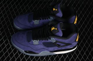 Zapatillas Air Jordan 4 Retro con un diseño inspirado en los Lakers. - Combinación de colores morado y amarillo. - Detalle del logo Jumpman en amarillo. -talla 36 a 48