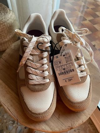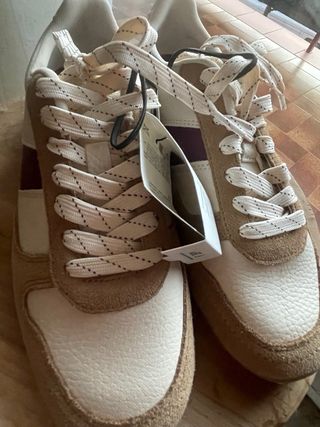 Zapatillas casual/deportivas en tonos beige, crema y detalle burdeos. Diseño cómodo y combinable, ideales para el día a día. Material con acabado tipo piel y ante. Cordones en color claro con detalle discreto. ✨ Estado: nuevas, sin usar (con etiquetas) Cualquier duda, ¡pregúntame sin problema! 😊