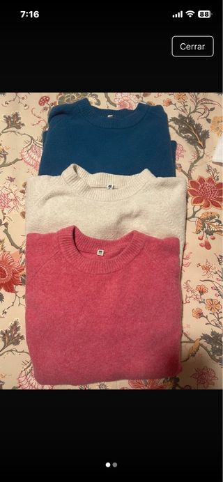 Conjunto de tres jerséis de la marca Uniqlo. - Jersey azul. - Jersey beige. - Jersey rosa.
