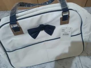 Bolso canastilla de estilo clásico, perfecto para llevar lo esencial. - Diseño en blanco con detalles en azul marino. - Adorno de lazo en la parte frontal. - Asas cómodas para su transporte.