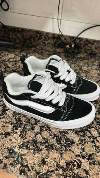 Zapatillas Vans Knu Skool en color negro y blanco. Un clásico para el día a día. Originales muy poco uso talla 37 23,5cm (uso 38 y me van perfectas) - Diseño de caña baja. - Cordones blancos. - Suela de goma blanca.