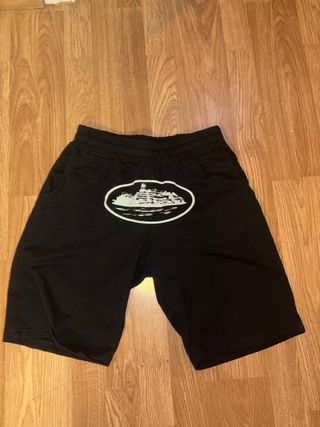 Pantalón corto de la marca Corteiz en color negro. - Talla M. - Diseño con estampado ovalado en blanco. - Cintura elástica.