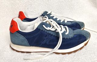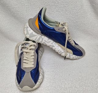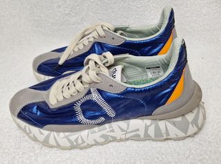 Zapatillas deportivas de la marca Duuo en talla 41. con su caja - Diseño moderno en tonos azul y gris. - Detalle en naranja en la parte trasera. - Suela con estampado geométrico.