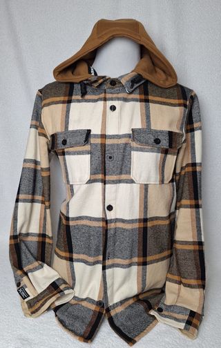 Chaqueta de paño con un diseño a cuadros y gorro incorporado. - Estilo camisero. - Dos bolsillos en el pecho. - Cierre de botones.