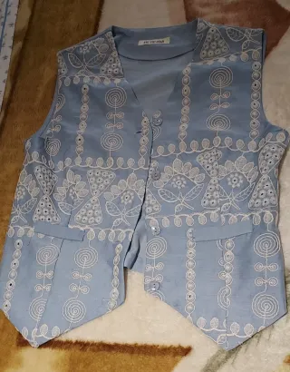 Chaleco huertano con un diseño de rayas verticales y estampado floral. - Diseño de rayas verticales en azul y blanco. - Detalle de estampado floral en tonos azules y dorados. - Dos bolsillos delanteros. - Cierre con botones oscuros.