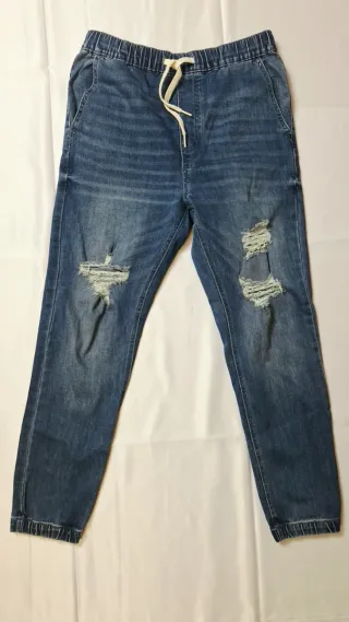 Pantalones vaqueros de Pull&Bear para hombre con un estilo moderno y desgastado. - Diseño con rotos y efecto desgastado. - Cintura elástica con cordón. - Puños ajustados en los tobillos.