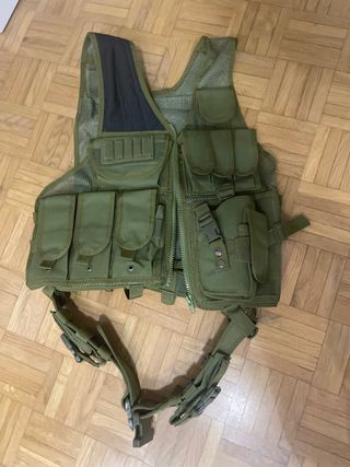 Chaleco militar táctico de color verde mimetico, ideal para actividades outdoor ipo airsoft, painball, etc, tiene cartuchera para pistola y departamentos para cargadores tanto de pistola como de subfusiles automáticos. Solo ha tenido un uso, esta nuevo. Precio no negociable. - Diseño multibolsillos para mayor capacidad. - Confeccionado en tejido resistente. - Espalda de malla transpirable.