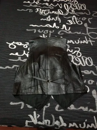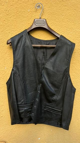 Chaleco de cuero negro con cierre de botones click. - Dos bolsillos frontales. - Cuello en V. - Diseño sin mangas. - Cinturón ajustable en la parte trasera. - Ancho entre sisas 58 cm, ancho entre hombros 49 cm, lo más largo 73 cm.