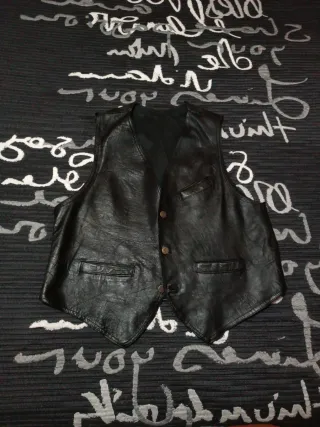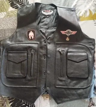 Chaleco de cuero estilo motorista, ideal para lucir en tus rutas. Escucho oferta. No admito devolución. - Diseño clásico con cuello en V. - Cierre de botones metálicos. - Dos bolsillos superiores con solapa y botón. - Dos bolsillos inferiores con cremallera.