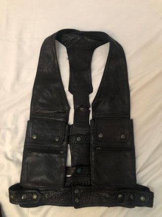 Arnés de cuero negro, ideal para motociclismo. Diseño funcional con múltiples bolsillos. - Fabricado en cuero. - Cierre con botones a presión y cremalleras. - Varios compartimentos de almacenamiento.