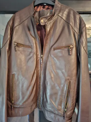 Cazadora de cuero marrón con cuello alto y cierre de cremallera. Talla 52 - Diseño moderno. - Bolsillos frontales con cremallera. - Puños ajustables.