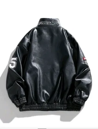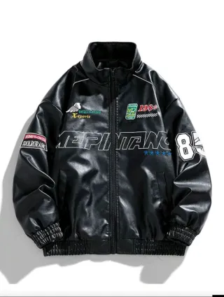 Chaqueta de cuero con un diseño moderno y detalles llamativos. - Material: Cuero sintético. - Estilo: Moda urbana/racing. - Cierre de cremallera. - Cuello alto. - Puños y cintura elásticos.