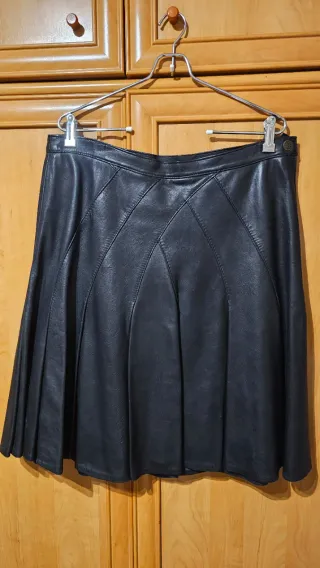 Conjunto falda cuero, camisa blanca, chaleco y cor