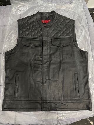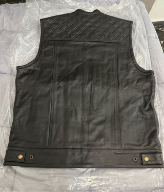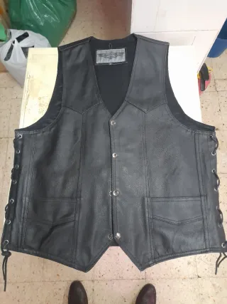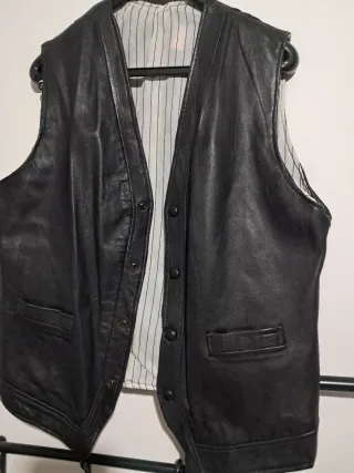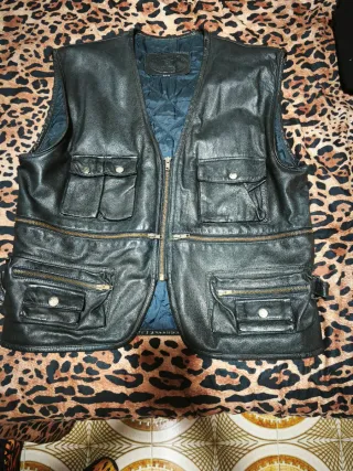 Vendo un chaleco de cuero nuevo en talla XL, sin estrenar. Está fabricado en cuero auténtico. Con detalles acolchados, cremallera, botones a presión y muchos bolsillos, tanto en el interior como en el exterior.