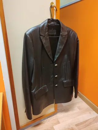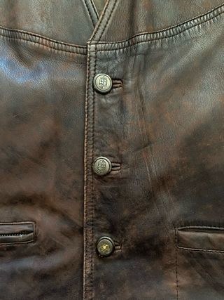 Más prendas de cuero en mi perfil. Bastante usada, pero en muy buen estado general, sin defectos ni desgaste, solamente señales de uso previo. Forro de algodón con algunos pequeños agujeros ya remendados en la zona del cuello y la cintura. Cuero vacuno de excelente calidad ligeramente rígido y muy resistente. Grosor medio m Textura de grano medio. Color marrón muy oscuro, casi negro. Talla M/L de corte oversized, queda holgada. Doble botonadura en los puños, trabillas ajustables en los costados.Mangas anchas, talle relativamente corto y estrecho. El modelo mide 1,74 y pesa 82 kgs. Medidas indicadas en las fotos. Preguntar cualquier
