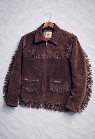 Chaqueta de cuero con un diseño único y detalles de flecos. - Material: Cuero - Color: Marrón - Estilo: Flecos en mangas y bajo - Bolsillos frontales con cremallera