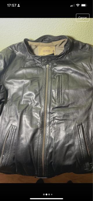 Más prendas de cuero en mi perfil. Bastante usada, pero el cuero está en muy buen estado, excepto un desgarro ya reparado y poco visible junto a la costura superior del bolsillo derecho. Las costuras de los codos se han vuelto a coser, no se nota. Forro de algodón y poliéster en muy buen estado sin roturas. Cuero vacuno de excelente calidad, ligeramente rígido y muy resistente. Grosor medio. Textura lisa y brillante. Color negro intenso. Etiqueta indica talla L, pero en realidad es más bien una M ajustada. El modelo mide 1,74 y pesa 80 kgs. Medidas indicadas en las fotos. Preguntar cualquier información sin compromiso.
