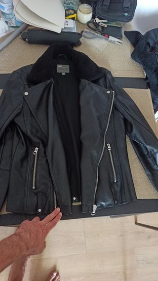 Chaqueta de cuero sintético con cuello de pelo. - Cierre de cremallera. - Bolsillos con cremallera. Tiene algunos desperfectos en el hombro derecho. Precio negociable
