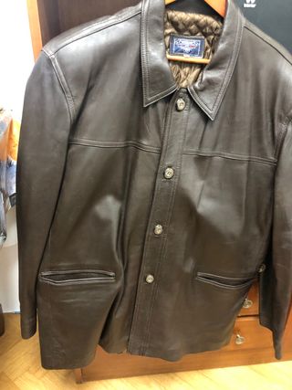 Cazadora de cuero talla L de color marrón. Diseño aviador para hombre (También para mujer), corte amplio con grandes bolsillos exteriores e interiores. Está en perfecto estado, tiene pequeñas manchas en el forro interior y algún ligero roce en el exterior, inevitable con los años. Nada importante, de verdad. Es de piel auténtica, pesa y huele a cuero. Se compró en los años 90 en peletería. Una cazadora duradera, para el frío fabulosa y además aguanta la lluvia sin problema. No lo dudes!