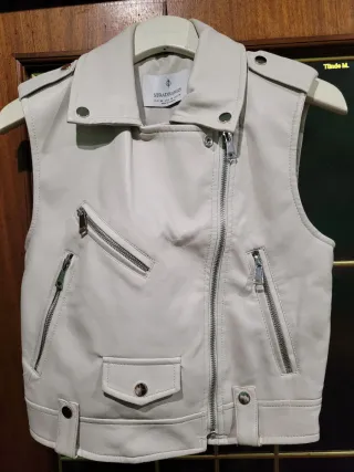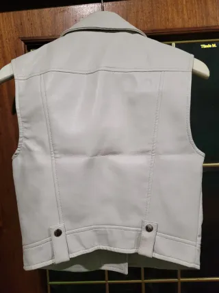 Chaleco efecto piel en color blanco hielo. Diseño tipo biker. Cierre de cremallera. Forro interior y multibolsillos. Sin estrenar.