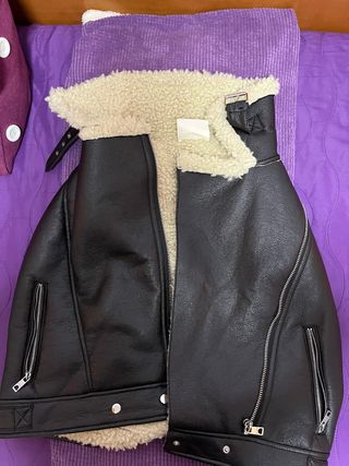 Chaleco de piel sintética con forro interior de borreguito. - Cierre de cremallera. - Bolsillos laterales con cremallera. - Detalle de cinturón en el cuello. - Puños ajustables.