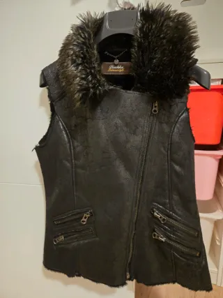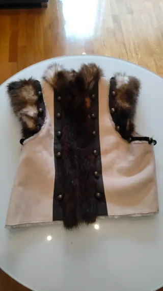 Chaleco con un diseño único y llamativo. - Acabado en piel sintética beige. - Detalle central de pelo marrón. - Adornos metálicos en la parte frontal. - Mangas con pelo sintético.
