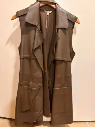 Chaleco de piel en color marrón de la marca Massimo Dutti. - Diseño sin mangas. - Cierre de cremallera frontal. - Bolsillos laterales Tiene una marca en un bolsillo, puede ser de estsr guardado. Se ve en una foto