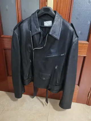 Cazadora estilo motero. Cazadora tipo piel negra pull bear. La vendo porque no es de mi estilo. Nueva con etiqueta. Sin estrenar. - Diseño cruzado con cremallera. - Bolsillo con cremallera en el pecho. - Cuello con solapas y botones a presión.