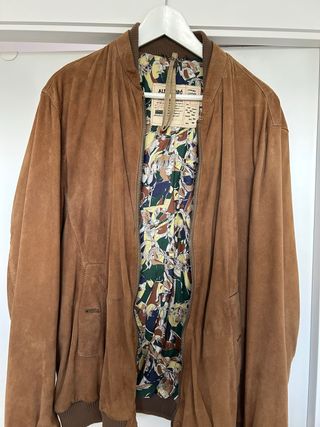 Chaquetón de hombre, de Massimo Dutti, en piel de color marrón. Confeccionado en piel natural 100% ovina, de doble faz, nobuck por fuera y la parte interior de pelo, con acabado suave y extra cálido. Cierre de botones. Prenda de calidad que nunca pasa de moda, combina con cualquier tipo de ropa. Una prenda para toda la vida. Tiene un bolsillo interior con cremallera. Talla XL. Completamente nuevo y sin ningún desperfecto. De plena tendencia.