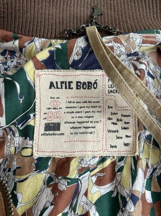 Chaqueta de piel de la marca Alfie Bobo. Un diseño clásico y versátil. - Material exterior de piel. - Forro interior con estampado llamativo. - Cierre de cremallera frontal. - Puños y cuello elásticos.