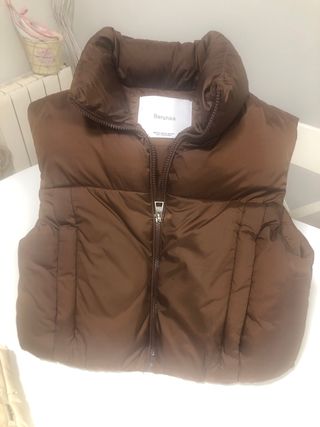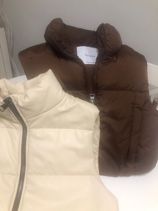 Dos chalecos uno de la marca Bershka, uno en color beige y otro en marrón. - Chaleco beige con acabado tipo piel. - Chaleco marrón acolchado.
