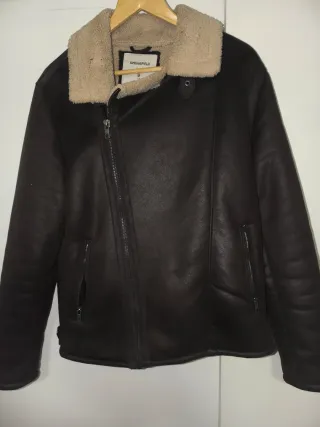 Cazadora marrón de piel sintetica estilo aviador con forro de borrego. - Cierre de cremallera. - Bolsillos laterales con cremallera. - Cuello ancho de borrego.