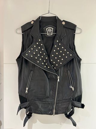Chaleco estilo motero con un diseño llamativo. - Confeccionado en piel. - Adornado con tachuelas plateadas. - Cierre frontal de cremallera. - Bolsillos laterales con cremallera. - Detalle de cintas con hebilla en la parte inferior. Tiene solo un pequeño desgaste al fondo que se puede ver en foto. Interno en viscosa y acetato Es una M que viste pequeña