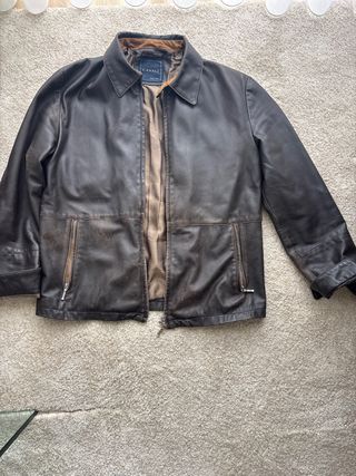 Cazadora de piel con un diseño clásico y versátil. - Cierre de cremallera frontal. - Dos bolsillos en el pecho con solapa. - Bolsillos laterales. - Cuello con solapa y cierre de hebilla. - Puños y cintura elásticos.
