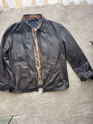 Talla 42/L en España/// es un 48 italiano Chaqueta de piel para hombre de la marca Canali. Un clásico atemporal con un diseño elegante. - Confeccionada en piel de alta calidad. - Color marrón oscuro con un acabado desgastado. - Cierre de cremallera frontal. - Dos bolsillos laterales con cremallera.