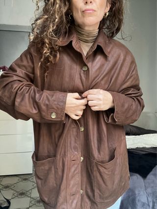 Chaqueta de piel auténtica en color marrón, con un diseño inspirado en el estilo Barbour. Una prenda clásica y versátil. - Cierre de botones dorados. - Dos bolsillos frontales. - Cuello camisero.