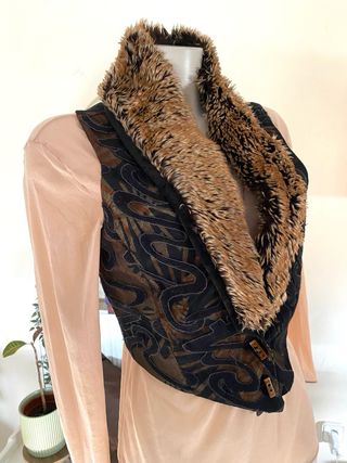 Chaleco llamativo con un look lujoso ✨ Este precioso chaleco Legatte Jeans combina un aire bohemio-western con un acabado elegante. Su estampado texturizado en cálidos tonos tierra, el suave cuello de piel sintética y los cierres con botones de madera lo convierten en un verdadero punto de atracción. ✔️Nuevo y sin usar (diseñado con un aspecto desgastado/vintage) ✔️Talla XL ✔️Material: Poliéster ✔️Cómodo, ligero y perfecto para combinar con otras prendas. ✔️Ideal para llevar sobre una blusa, un vestido o un moño. Una prenda elegante que aporta carácter, calidez e individualidad a cualquier look. elo