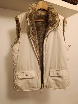 Chaleco reversible de la marca GAP con un lado en tejido beige y otro con pelo sintético. - Cuello alto con pelo. - Cierre de cremallera. - Dos bolsillos delanteros con botón.