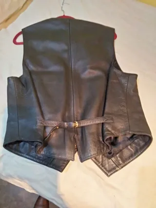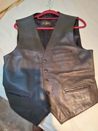 Chaleco de piel de alta calidad. Chaleco vintage 100% Piel , Talla M, Color Negro, Peleteria Jacinto Rodriguez Madrid, piel suave al tacto con un acabado impecable y forro interior, diseño clasico con cierre de botones y bolsillos funcionales en la parte delantera y correa ajustable en la parte trasera , ideal para un estilo motorista o casual - Confeccionado en piel 100%. - Diseño clásico y elegante. - Cierre de botones. - Dos bolsillos frontales.