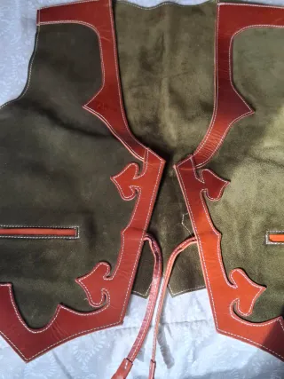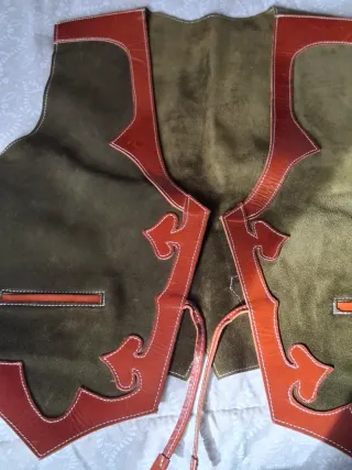 Chaleco cartujano de ante y piel con un diseño muy cuidado. - Adornos de piel en contraste. - Costuras blancas visibles. - Cordones para ajuste.