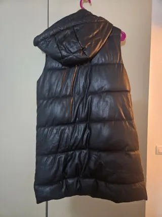 Chaleco largo de polipiel con capucha. - Cierre de cremallera. - Bolsillos frontales con botón. - Diseño acolchado. Se puede recoger en Salt o Santa Eugenia, a parte de aqui y envío.