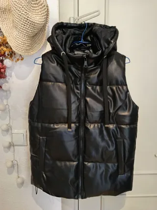 Chaleco con acabado efecto piel. - Diseño acolchado. - Capucha integrada. - Cierre de cremallera frontal. - Bolsillos laterales.