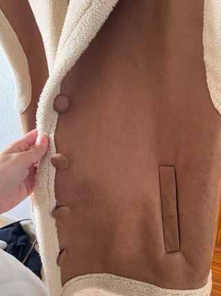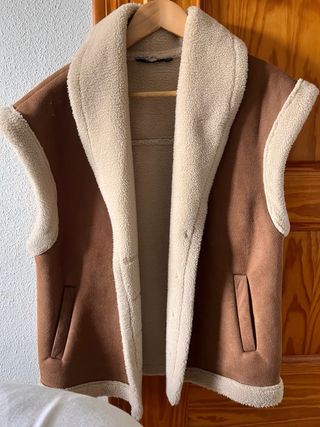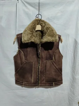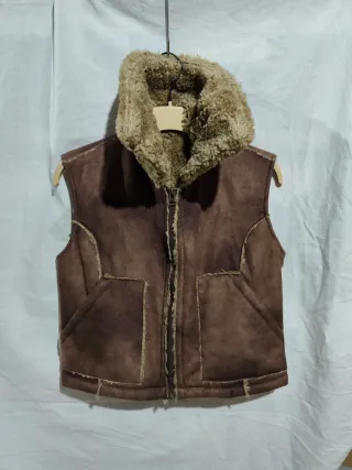 Chaleco de efecto piel sintética en color marrón, con forro interior de borreguito. - Diseño sin mangas. - Cuello amplio con acabado de borreguito. - Dos bolsillos frontales.