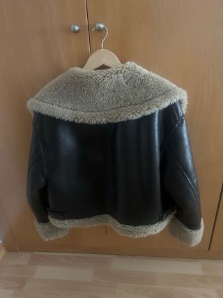 Cazadora de estilo aviador con exterior efecto piel y forro interior de borrego. Usada dos veces. Esta nueva - Cierre de cremallera. - Cuello con solapas. - Puños y bajo con detalle de borrego.