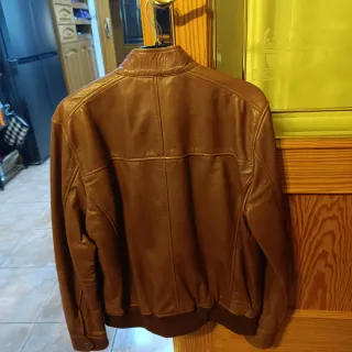 Cazadora de piel acolchada con poco uso y bien cuidada de color marrón. Un clásico atemporal para cualquier ocasión. - Material: Piel auténtica. - Diseño elegante con cuello. - Cierre de cremallera frontal. - Puños y cintura elásticos. El único defecto es que le falta un automático que se le puede poner. Bolsillo interior Medidas Hombros 44cm Largo 66cm