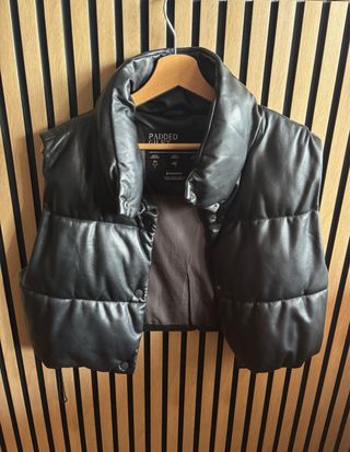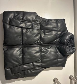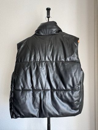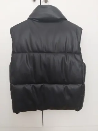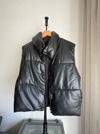 Chaleco acolchado estilo puffer en acabado cuero sintético (efecto piel). Una prenda clave para hacer "layering" (combinar capas) este invierno sobre sudaderas o jerséis. Color: Negro mate, elegante y muy combinable. Detalles de diseño: Textura: Tacto suave efecto piel de alta calidad. Cuello: Cuello alto acolchado para proteger del viento. Cierre: Botones a presión (snaps) forrados a juego con el tejido para un look minimalista. Acolchado: Paneles grandes que mantienen muy bien el calor sin pesar demasiado.