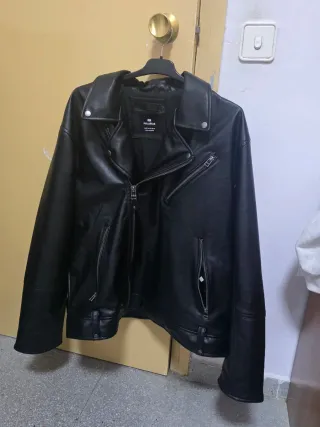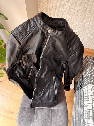 Cazadora de estilo motero con acabado efecto piel. Esta desgastada en la zona del cuello de tenerla guardada. - Cuello redondo. - Cierre de cremallera. - Bolsillos frontales con cremallera. - Detalle de costuras en hombros.