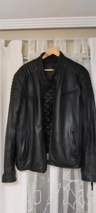 Chaqueta estilo biker confeccionada en piel. Talla XL - Protectoras - Cuello redondo con cierre de botón. - Cremallera frontal. - Puños con cremallera. - Bolsillos laterales con cremallera. - Detalle de costuras en hombros.