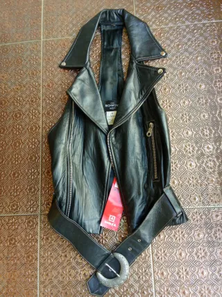Chaleco de diseño en piel. - Color negro. - Talla M (equivalente a 38-40 / 48-50). - Cierre de cremallera. - Cinturón con hebilla decorativa. Nuevo con etiqueta Doble A qué marca 450 euros Hombros descubiertos
