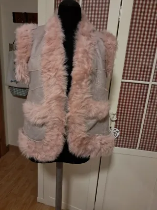 Elegante chaleco de piel con detalles de pelo en tonos rosa y beige. Una prenda única para añadir estilo a tu look. - Diseño con parches de piel y pelo,en rosa empolvado.A estrenar con etiquetas.Talla M. - Adorno de pelo suave en cuello, delanteros y bolsillos. - Talla única.